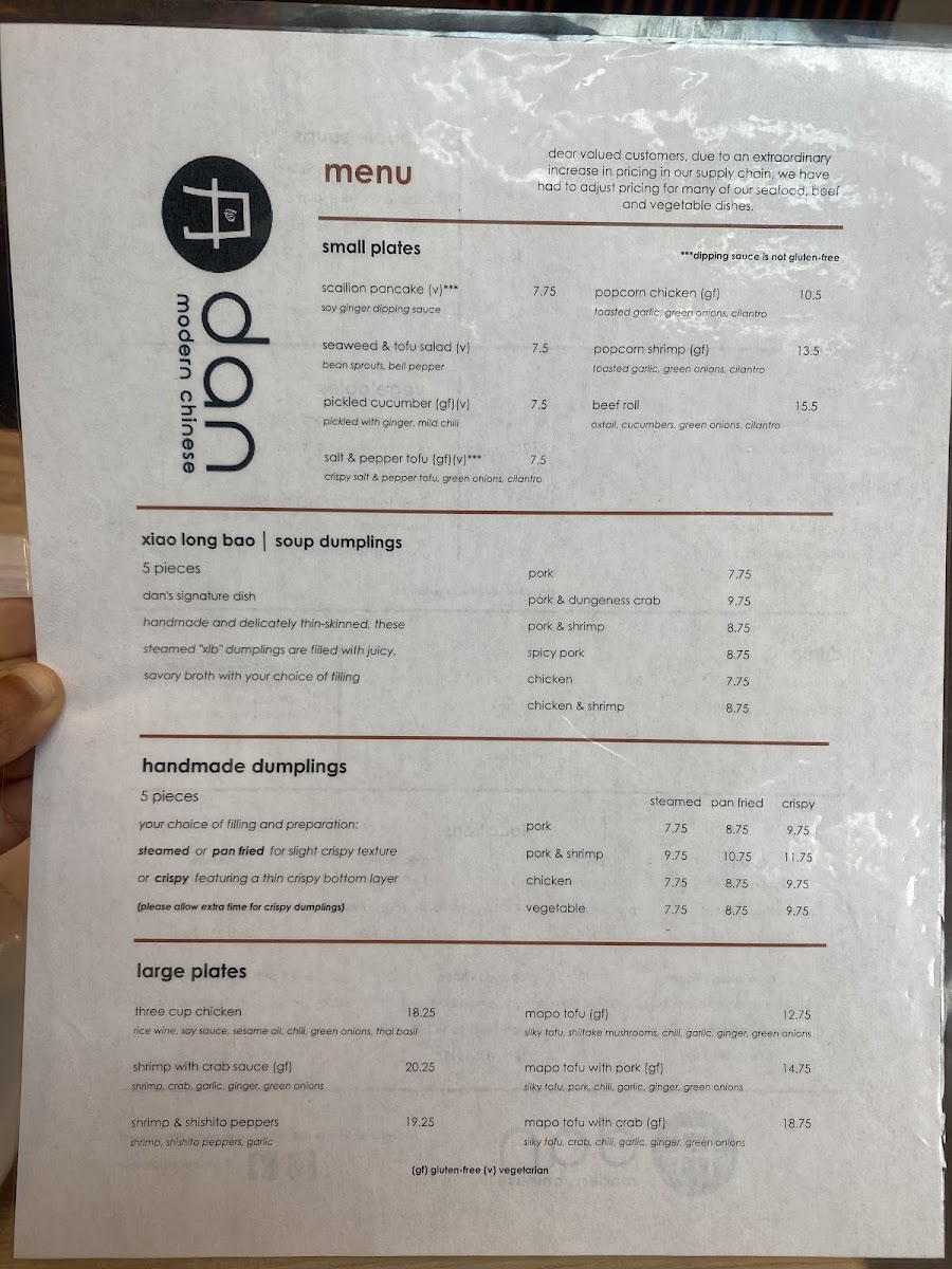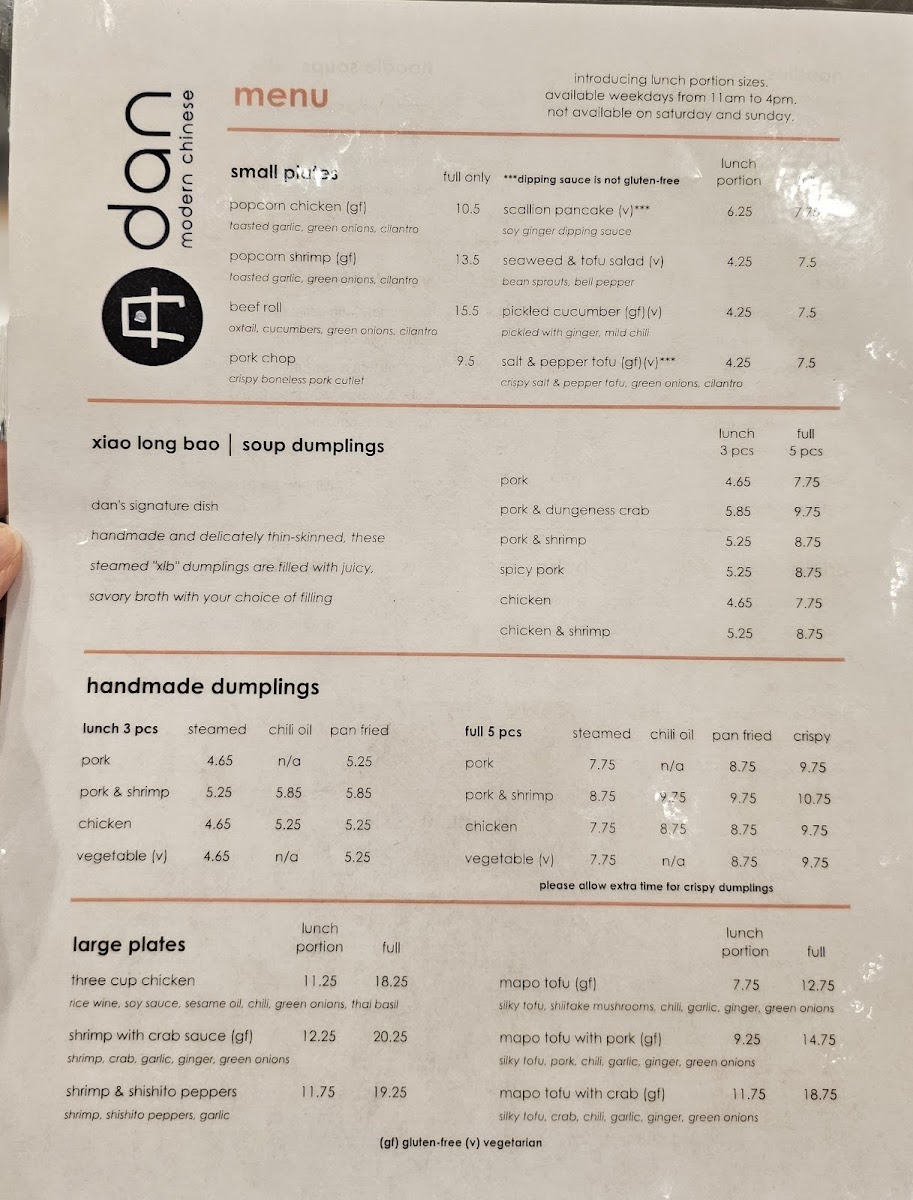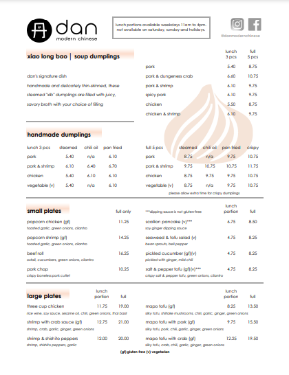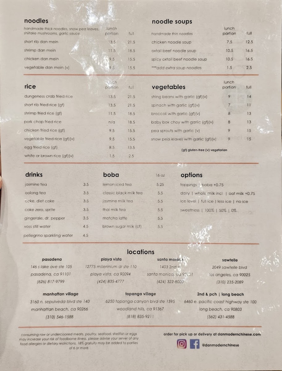 Dan Modern Chinese in Long Beach offers a diverse and flavorful menu that caters to various tastes. For dumpling lovers, the selection includes XLB Dumpling varieties such as Pork ($9.50), Pork Crab ($10.50), Pork Shrimp ($10.50), and Spicy Pork ($10.50), with options like Steamed Dumplings and Pan Fried Dumplings for those seeking different textures. For a crispy delight, the Crispy Dumplings and Chili Oil Dumplings come in flavors like Pork Shrimp ($9.50) and Chicken ($8.50). Small plates such as the Scallion Pancake ($6.50) and Seaweed Tofu Salad ($7.50) offer light, refreshing starters. Larger plates include favorites like Three Cup Chicken ($14.50) and Mapo Tofu ($12.00), while noodle enthusiasts can enjoy options like Dan Mein Short Rib ($12.00) and Dan Dan Noodles ($10.50). The fried rice options are equally tempting, including Fr Crab ($14.00) and Fr Short Rib ($13.50). Vegetables such as Spinach ($7.00) and Baby Bok Choy ($8.00) are also available for a healthy side. The menu is complemented by a variety of drinks, from refreshing Iced Jasmine Tea ($3.50) to popular boba flavors like Classic Black Milk Tea ($5.50). Whether you're in the mood for a light bite or a hearty meal, Dan Modern Chinese has something for every palate.