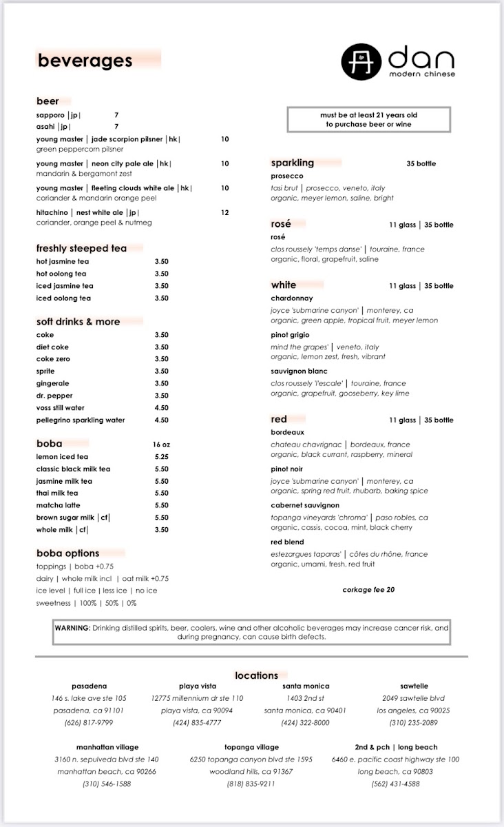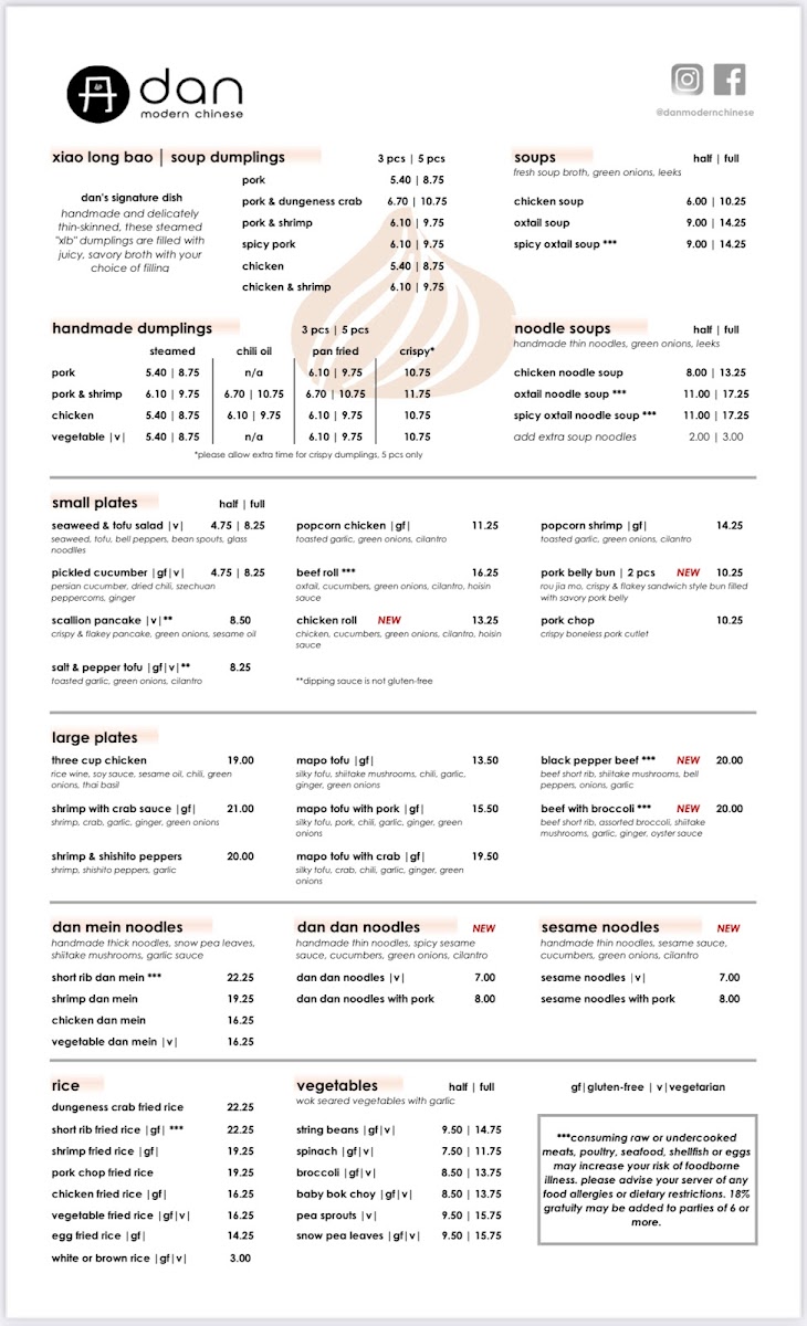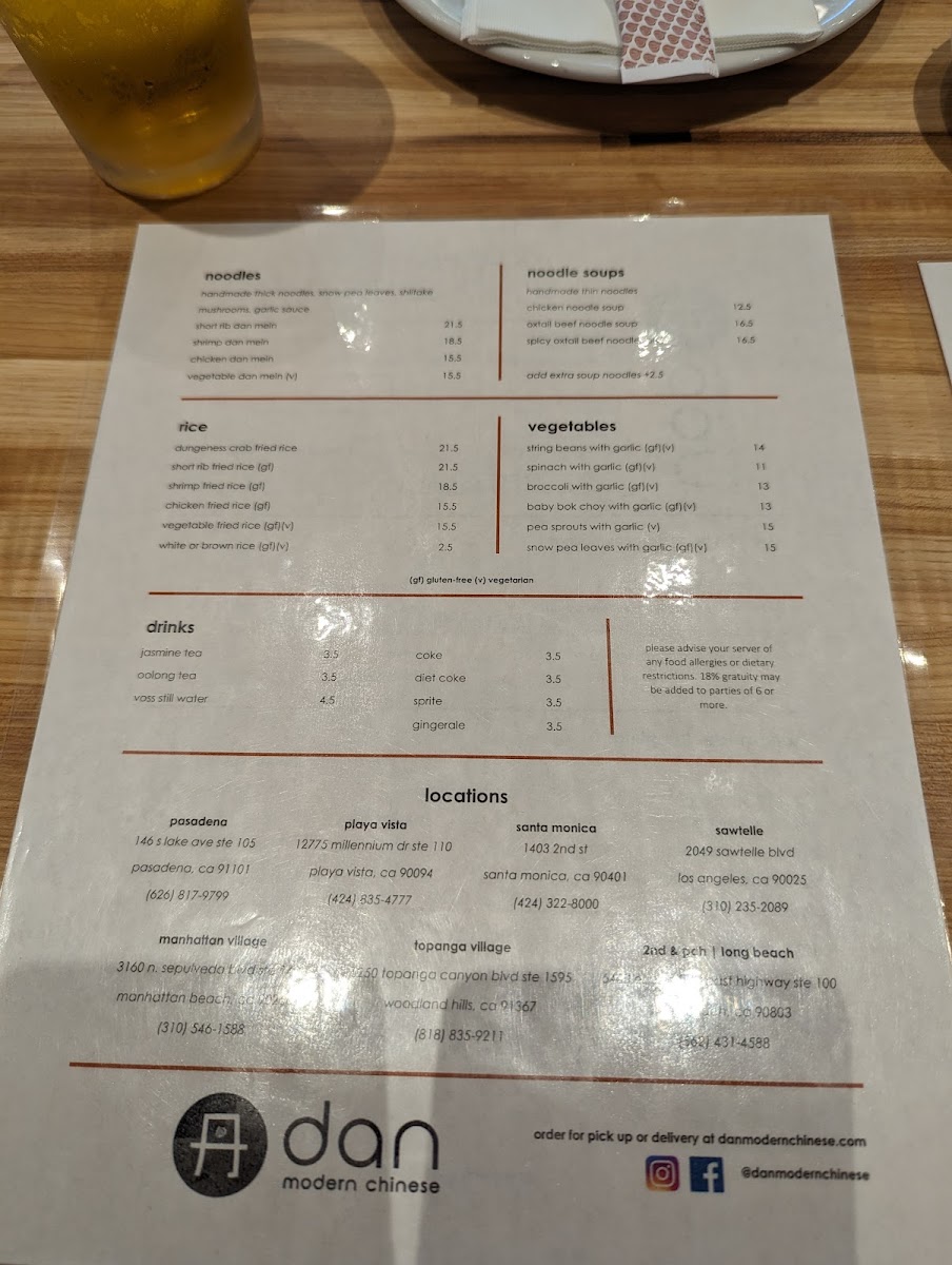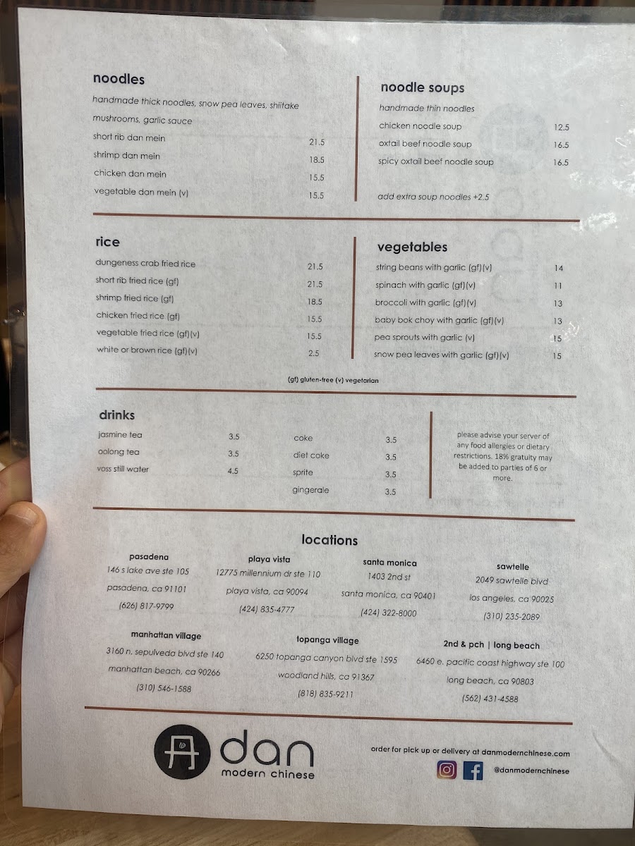 Dan Modern Chinese in Long Beach offers a diverse and flavorful menu that caters to various tastes. For dumpling lovers, the selection includes XLB Dumpling varieties such as Pork ($9.50), Pork Crab ($10.50), Pork Shrimp ($10.50), and Spicy Pork ($10.50), with options like Steamed Dumplings and Pan Fried Dumplings for those seeking different textures. For a crispy delight, the Crispy Dumplings and Chili Oil Dumplings come in flavors like Pork Shrimp ($9.50) and Chicken ($8.50). Small plates such as the Scallion Pancake ($6.50) and Seaweed Tofu Salad ($7.50) offer light, refreshing starters. Larger plates include favorites like Three Cup Chicken ($14.50) and Mapo Tofu ($12.00), while noodle enthusiasts can enjoy options like Dan Mein Short Rib ($12.00) and Dan Dan Noodles ($10.50). The fried rice options are equally tempting, including Fr Crab ($14.00) and Fr Short Rib ($13.50). Vegetables such as Spinach ($7.00) and Baby Bok Choy ($8.00) are also available for a healthy side. The menu is complemented by a variety of drinks, from refreshing Iced Jasmine Tea ($3.50) to popular boba flavors like Classic Black Milk Tea ($5.50). Whether you're in the mood for a light bite or a hearty meal, Dan Modern Chinese has something for every palate.